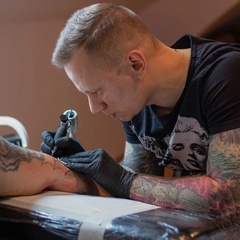 Татуировка, изображающая выразительное лицо французского бульдога, окруженное изящными декоративными элементами. Каждый штрих подчеркивает характер и индивидуальность животного, создавая эффект глубины и реалистичности. Эта работа сочетает в себе мастерство татуировщика и любовь к питомцам, делая ее уникальным произведением искусства на коже.